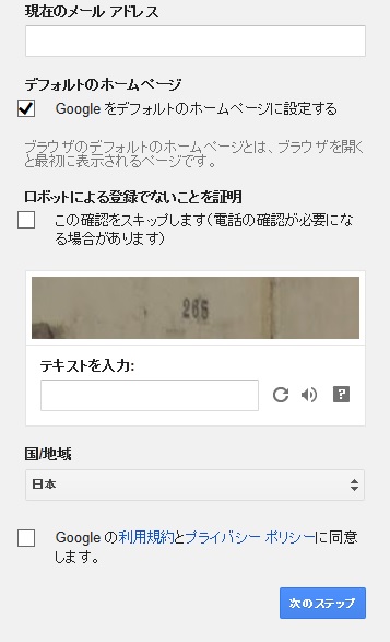 ・最後に、Googleの利用規約とプライバシーポリシーに同意しますというボックスにチェックマークをいれ、次のステップをクリックして下さい。