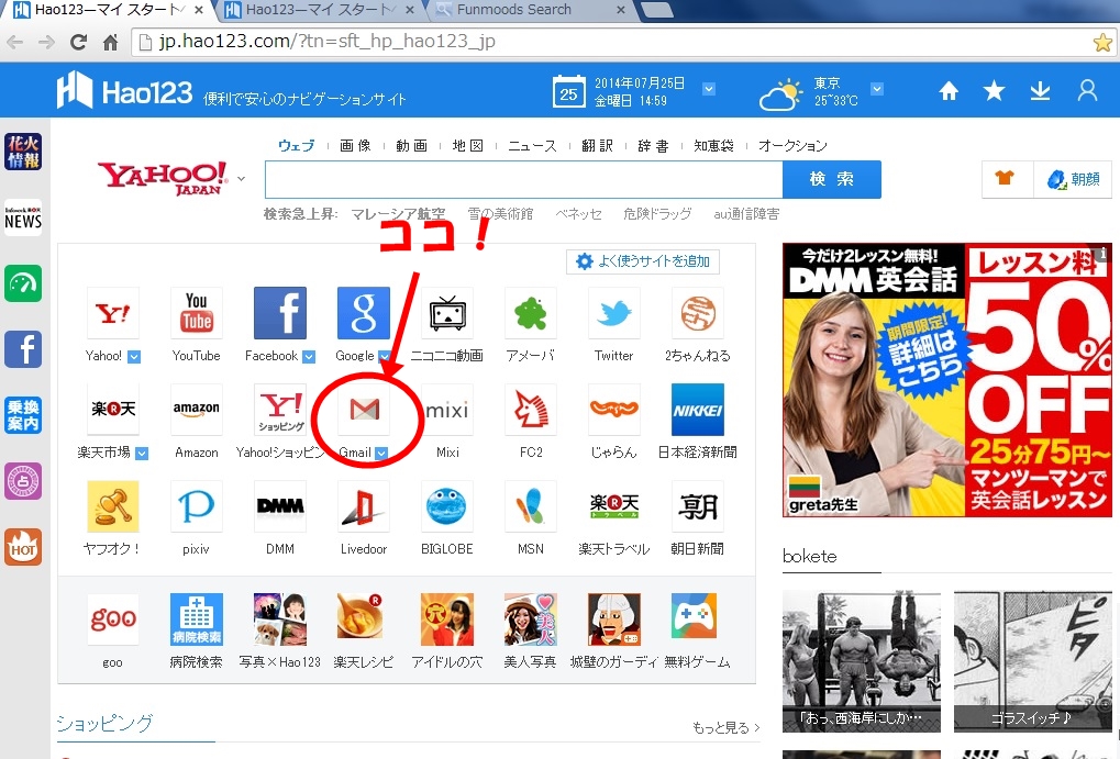 このページのGmailのMというところをクリックするだけで、自分のGmailを確認できます
